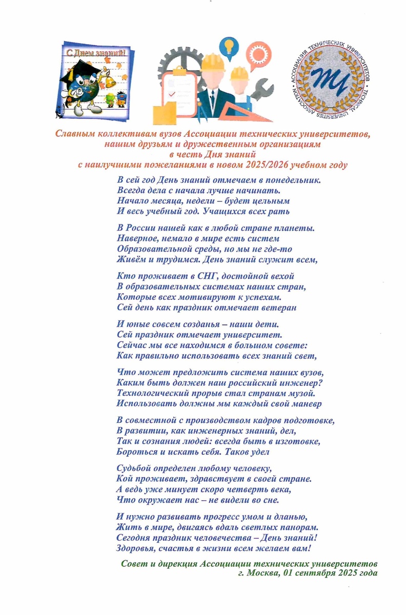 ✒Ассоциация технических университетов поздравила Тверской Политех с Днём знаний «Славным коллективам вузов Ассоциации технических университетов, нашим друзьям и дружественным организациям в честь Дня знаний с наилучшими пожеланиями в новом 2025/2026 учебном году».