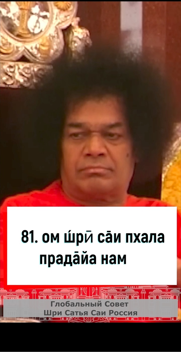 108 имён Шри Сатья Саи Бабы К 100-летию Бхагавана мы продолжаем воспевать 108 имён Шри Сатья Саи Бабы! 81. Ом Шрӣ Сāи Пхала Прадāйа Намаха «Пхала» означает «Плод» (Последствие, Результат). «Прада» означает «дарующий». «Пхала» или «Последствие» – это плод Кармы. Карма имеет два значения: в общем смысле она означает действие во всех его формах; в особом и техническом смысле она означает ритуальное действие, предписанное Ведами. Баба дарует плоды обоих видов Кармы. Баба заявляет, что Он является получателем всех подношений Богу, где бы они ни совершались, а также всех Яджн и Яг (ведических ритуалов). Когда Он снисходит, чтобы принять, Он дарует и плоды. Он сказал: «Я жду у двери вашей алтарной комнаты, прислушиваясь к молитвам, которые вы возносите Мне из глубины ваших сердец, чтобы Я мог их исполнить. Когда вы взываете: «О Господи, разве у Тебя нет глаз, чтобы видеть?», Мои глаза здесь, чтобы видеть! Когда вы молитесь: «Господи, разве у Тебя нет ушей, чтобы слышать этот плач