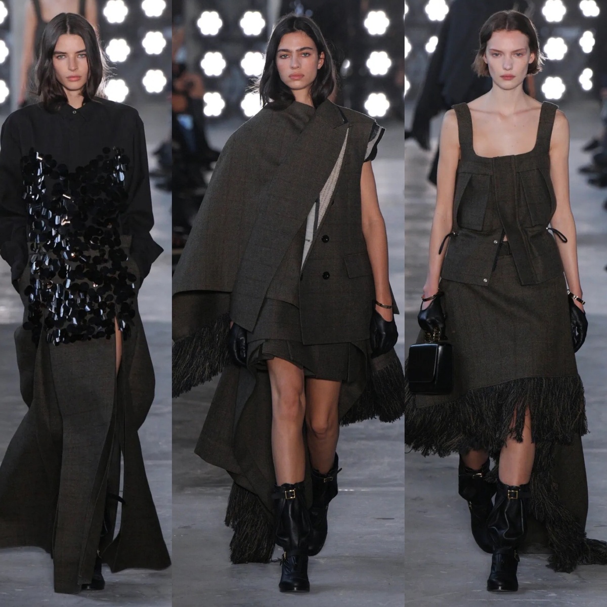 Коллекция Sacai Fall’25 RTW под названием «Один нежный момент» вновь затрагивает вопросы современности и модернизации. Читосе Абэ, как искусный апсайклер, создает новые филигранные образы, полные неординарности и неординарного кроя. Героиня коллекция - это женщина, чья одежда становится ее вторым я, логичным продолжением. Концепция «обёртывания» превращается в ритуал защиты, где привычные силуэты трансформируются в необычные формы. Трикотажные вставки становятся частью пуховиков и других предметов одежды; а мех и перья гармонично становится частью платьев, брюк и накидок. Каждая вещь в коллекции — это тихий протест против жёсткости. Форменные пиджаки и парки некогда строгие, теперь мягкие и обволакивающие. Их плотная ткань теперь струится, послушно следуя за движениями тела. Костюмные ткани, пайетки и меховая отделка гармонично сплетаются воедино. Вышивка изящна и воспевает чувственность и чистоту. Конечно, для кого-то это слишком и вовсе не носибельно. Но авангард ещё нико