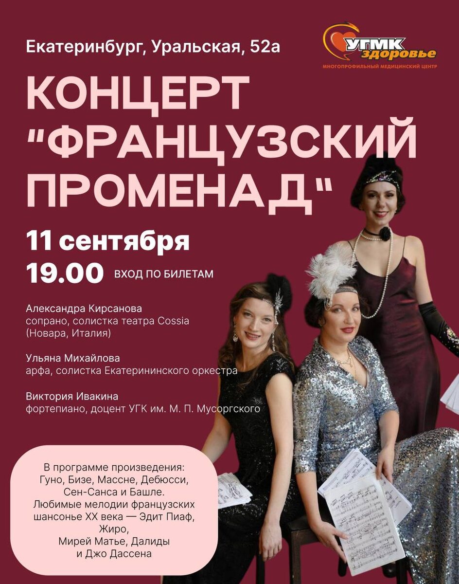 Приглашаем вас на концерт «Французский променад»! Этот вечер погрузит вас в неповторимую атмосферу парижских улиц 1920-х годов. Начнем музыкальное путешествие с торжественных оперных шедевров Гуно, Бизе, Массне. Затем обратимся к тонкому, изящному камерному творчеству Дебюсси, Сен-Санс, Башле. Наконец, вспомним любимые мелодии из репертуара французских шансонье ХХ века: Эдит Пиаф, Жиро, Мирей Матье, Далида, Джо Дассен. Программу исполнят: ✨артист Екатерининского оркестра Ульяна Михайлова (арфа) ✨солистка театра Coccia (Италия) Александра Кирсанова (вокал) ✨доцент УГК им. М. П. Мусоргского Виктория Ивакина (фортепиано) 11 сентября, 18:30 📍ул. Уральская, 52а Билеты доступны по ссылке. Проведите вечер с французским шармом!