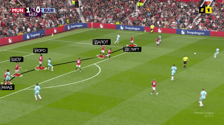 Амад – Шоу – Йоро – Далот – Де Лигт. Такое сочетание встречало атаку соперника. Четыре игрока из пяти – не на своих местах. Двое – Де Лигт и Шоу – сместились не на одну позицию в линии, а сразу на две. На своем месте только переделанный в латераля Амад. Схема с пятеркой в теории должна минимизировать такие проблемы. Но только не схема «МЮ».