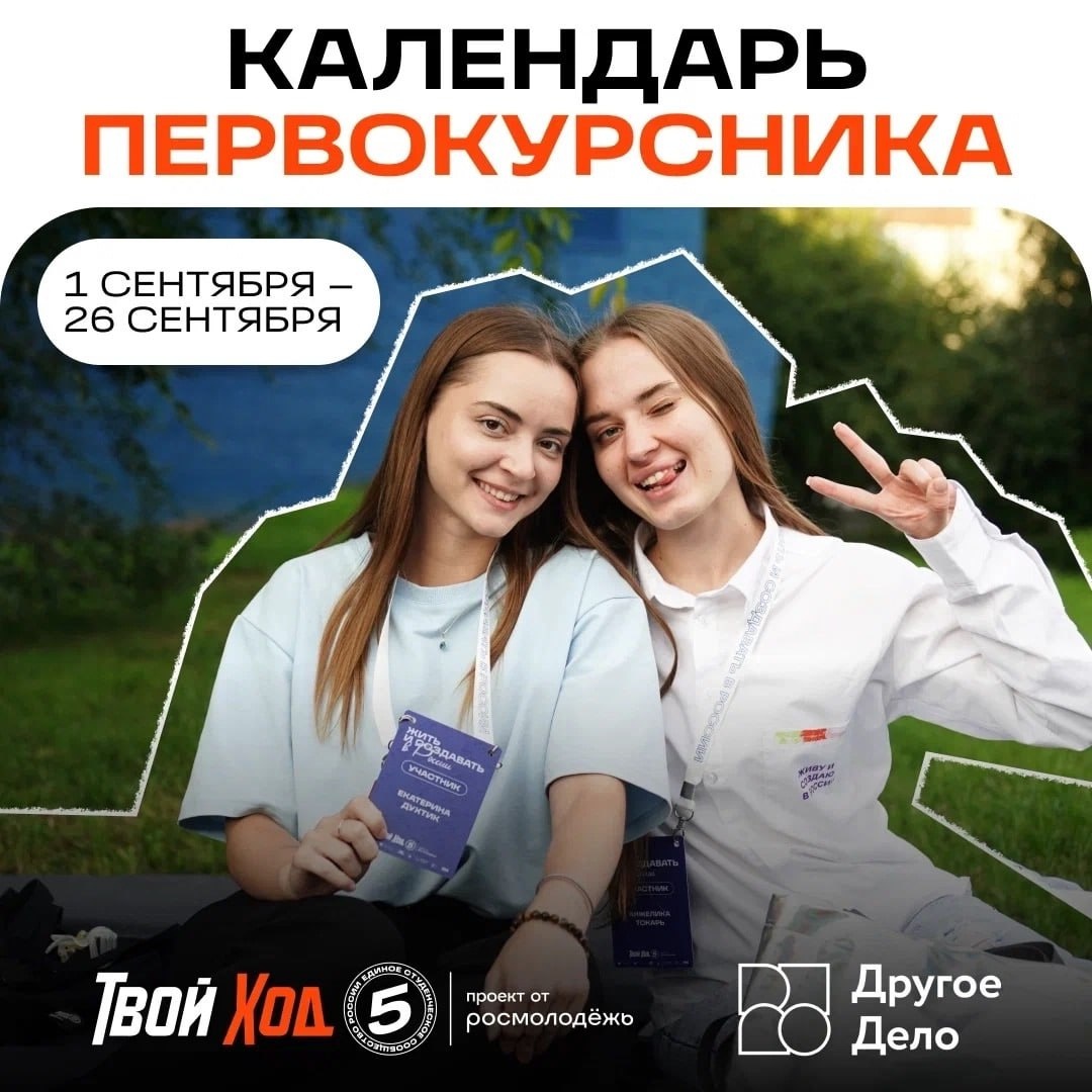 Первокурсники КГУ, внимание🔉 Представляем вам «Календарь Первокурсника» от Всероссийского студенческого проекта «Твой Ход». С 1 по 26 сентября 2025 года выполняй задания на платформе «Другое дело», получай баллы и выигрывай призы от партнёров. За каждое выполненное задание участник будет получать билет на розыгрыш, который пройдёт 26 сентября в сообществе проекта ВКонтакте. По вопросам участия во Всероссийском студенческом конкурсе «Твой Ход» обращайтесь к Юлии Реутовой — руководителю Проектного офиса молодежной политики КГУ «Механизм Действия». #ТвойХод #Росмолодёжь ❤️ КГУ | Подписаться