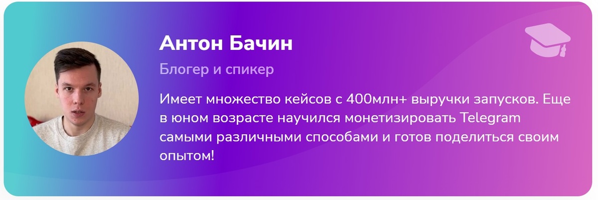 - 🎓 Авторитетный преподаватель: Антон Бачин — блогер и спикер с кейсами на 400 млн+ выручки. Уже в юном возрасте освоил монетизацию Telegram и готов делиться своим опытом.