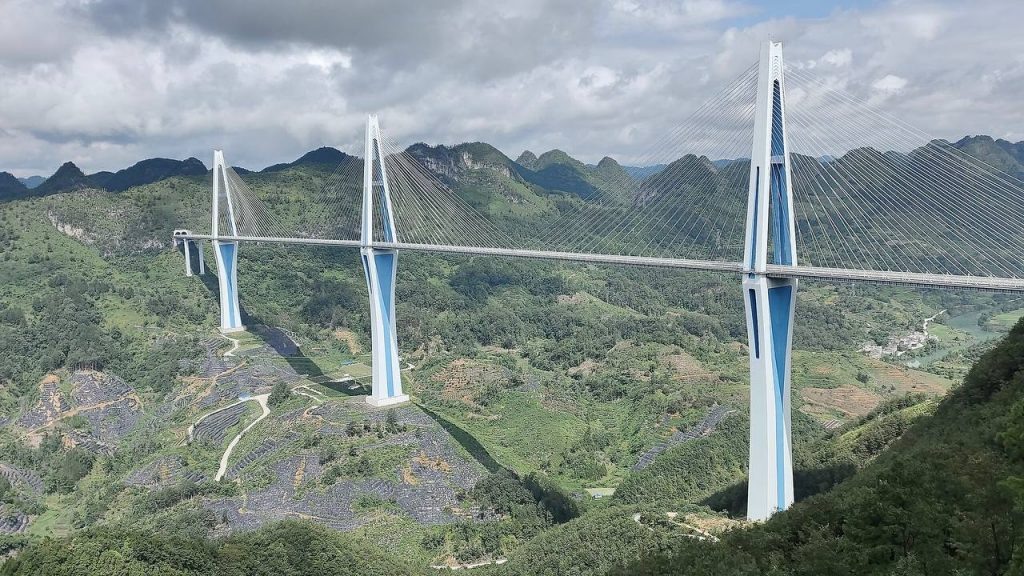 В провинции Гуйчжоу готовят к открытию самый высокий мост в мире. Подвесная конструкция длиной 2980 метров соединяет районы Лючжи и Аньлун, пересекает каньон Хуацзян и сокращает путь через него с часа до полутора минут.