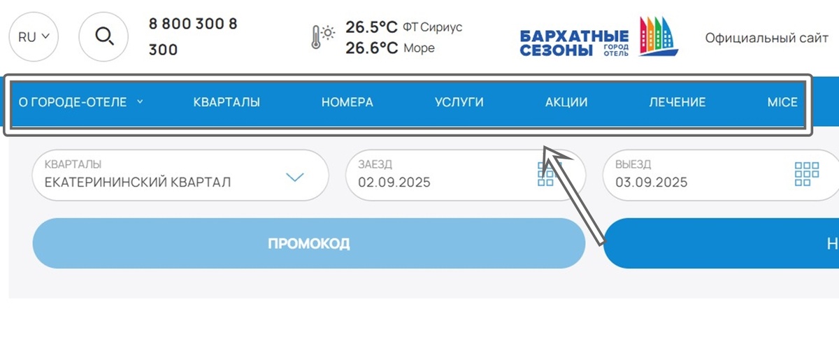 Сайты отелей. Они полезны, если вы точно знаете, в каком отеле вы хотели бы остановиться. На таких сайтах вы можете забронировать номер, напрямую связаться с сотрудниками отеля, посмотреть дополнительные услуги, спецпредложения, акции. Постоянным клиентам отели часто предлагают дополнительные бонусы или скидки. Вот так выглядит сайт одного из отелей в Сочи. С помощью верхнего меню можно ознакомиться с предложениями гостиничного комплекса.
