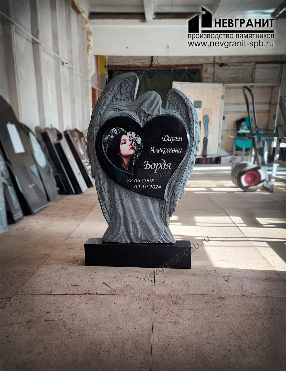 На фотографии запечатлен уникальный и трогательный памятник. Памятник выполнен в форме ангела с распростертыми крыльями, несущего в своем сердце память об усопшей. Основным элементом памятника является фигура ангела, искусно вырезанная из светло-серого гранита. Крылья ангела словно обнимают сердце, выполненное из черного гранита. В центре сердца размещен портрет молодой девушки - Дарьи Алексеевны Бордя. На сердце также выгравированы имя усопшей и даты ее жизни: 27.06.2008 - 09.10.2024. Фигура ангела установлена на небольшом основании, также выполненном из черного гранита. Дизайн памятника, сочетающий в себе символизм ангела-хранителя и форму сердца, передает чувство любви, защиты и скорби. Детализированная резьба по граниту создает впечатление легкости и воздушности, несмотря на материал. Сочетание светлого и темного гранита подчеркивает выразительность композиции и придает памятнику глубину. Выбор ангела в качестве основной фигуры символизирует невинность, чистоту и переход в иной м