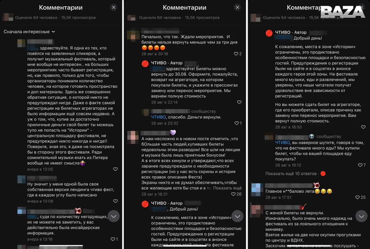 Поклонники Сергея Минаева купили дорогие билеты на его выступление, а попали лишь на музыкальный концерт — всё из-за странной регистрации. 30 августа в Москве прошёл фестиваль «Чтивофест». Помимо концерта, ключевым событием должно было стать выступление самого Минаева вместе с приглашёнными спикерами в специальной зоне «Истории». Один из поклонников писателя потратил на билеты для себя и жены 13 тысяч рублей, а в день фестиваля на всякий случай зашёл на сайт, чтобы проверить время начала события. Там он увидел плашку: «Регистрация на „Истории“ завершена». Оказалось, что просто купить билет недостаточно — чтобы попасть на выступление Минаева, требовалась отдельная предварительная регистрация. О ней не знали несколько десятков человек. По их словам, в момент покупки на сайте-агрегаторе об этом не было никакой информации. Предупреждение о регистрации размещали только в соцсетях фестиваля, а на сайте плашка появилась лишь после многочисленных жалоб. Организаторы объяснили необходимость