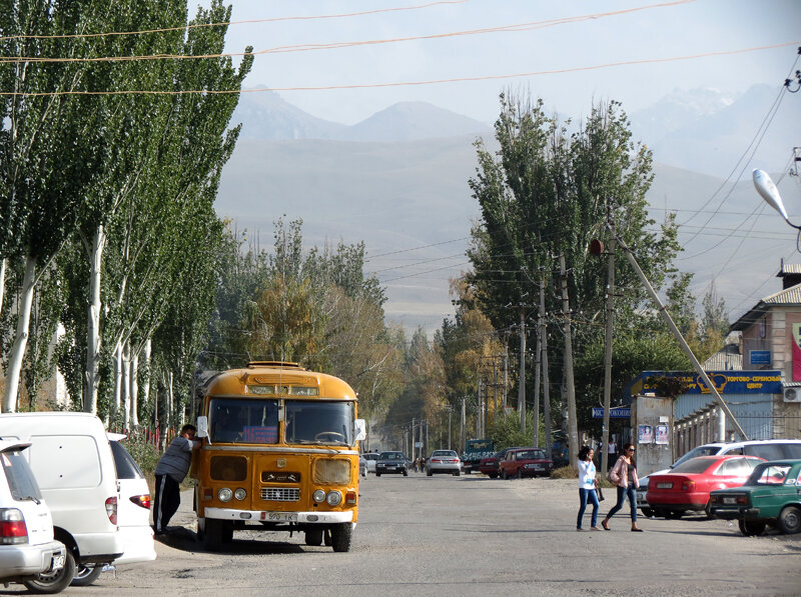 Каракол стоит не на берегу Иссык-Куля, а в нескольких километрах от озера, которое в восточный берег вдаётся двумя длинными заливами. У окончания залива Пржевальского и находится мыс с могилой путешественника. Посёлок на заливе - формально в подчинении города, его дальний район Пристань. Более того, в отличие от самого Каракола он так и не был переименован, поэтому фактически выходит, что ныне Каракол и Пржевальск - не одно и то же. С центральной площади, почти от подъезда гостиницы, где мы жили, туда каждые полтора-два часа ходит такая неожиданная в Киргизии вещь, как рейсовый автобус! Это, конечно, допотопный ПАЗик - но не частник по заполнению и даже не маршрутка.