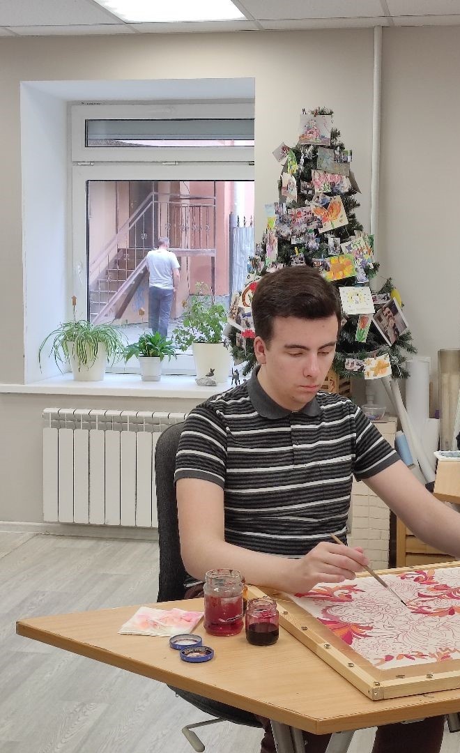 Всем знакома ситуация – тебе семнадцать, школа позади, впереди неизвестность, как космос. Скафандра нет, есть только желание определиться с профессией. Конечно, можно поступить просто и лаконично. Выбрать дело по душе, которое нравилось буквально с младенчества и идти по нему, подставляя лицо солнечным лучам. Это очень круто, это лучший вариант. Но часто бывает иначе. Впереди туман, в душе порыв, и важно чтобы он привёл в хорошее место. Чтобы вот всё ладно и складно было. Как у героя нашего небольшого рассказа. Итак, Иван. Ваня. Был тёплый апрельский день 2024 года, когда Иван перешагнул порог нашего Центра. Не зря говорят, что весна – время обновлений. Иван стал членом дружного коллектива нашей защищённой мастерской по батику. Прошёл месяц, и молодой человек отлично показал себя в тонком и нежном ремесле росписи батика. Ему это точно нравилось, это видели сотрудники мастерской и мама Вани. Но мир большой и многообразный и Ивану хотелось попробовать себя в нём, в большом мире. Тем боле