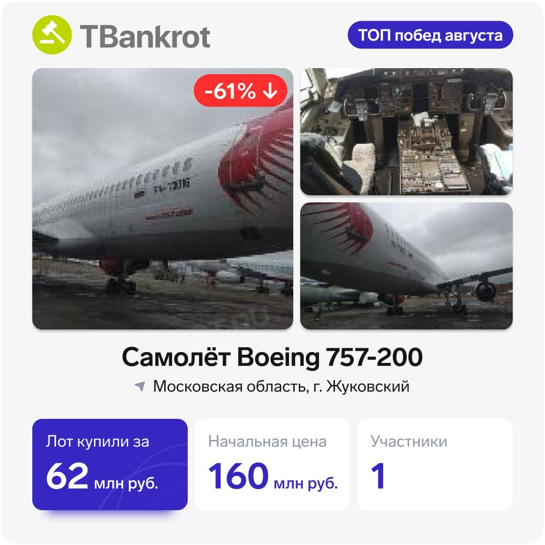 А где же конкуренция? 👀 Про торги любят слагать мифы: конкуренция бешеная, цены улетают в небеса, а новичкам там уже не место. Но если заглянуть в реальные сделки, картина оказывается спокойнее. Иногда достаточно просто вовремя подать заявку — и лот ваш. Посмотрите на эти победы августа. В каждом случае победитель был единственным участником 👇 ✈️ Самолёт Boeing 757-200 — 62 млн ₽ Падение цены: –61% 👉 https://clck.ru/3NxR6U 🏢 Помещение 129 м², Краснодар — 1,3 млн ₽ Падение цены: –72% 👉 https://clck.ru/3NxR5W 🏭 Здание 563 м², Сарапул — 2,7 млн ₽ Падение цены: –50% 👉 https://clck.ru/3NxR4c 🚗 Ford Mondeo, 2016 г. — 728 000 ₽ Падение цены: –30% 👉 https://clck.ru/3NxR3s 🏠 Дом 764 м² на 12 сотках, Москва — 20,8 млн ₽ Падение цены: –63% 👉 https://clck.ru/3NxR2b 📊 Конечно, это лишь часть сделок за месяц. Но факт остаётся фактом: даже интересные лоты можно забирать спокойно — без «бешеной конкуренции», о которой так любят слагать легенды. 🔍 Хотите проверить, как обстоят де