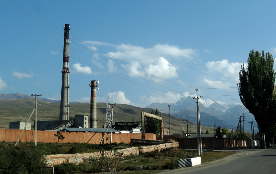 На площади у гостиницы мы обошли нескольких таксистов, и один из них согласился довести нас не слишком дорого. На верхнем выезде из Каракола - небольшая ТЭЦ, а впереди уже видна наша цель: ледяной пик Пржевальского (4272), ниже которого коричнево-зелёная сопка - на неё мы и едем.