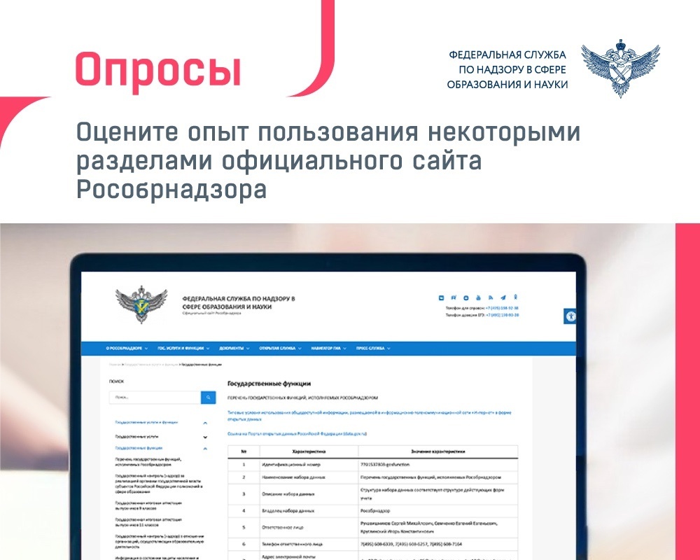 Помогите нам стать лучше, поделившись своим мнением о работе некоторых разделов официального сайта Федеральной службы по надзору в сфере образования и науки. Вы сможете ответить на вопросы опроса, если ранее пользовались разделами «Электронная приемная» и «Профилактика нарушений обязательных требований», а также интерактивной формой по проверке наличия сведений о выданных документах об образовании и (или) о квалификации в Федеральном реестре сведений о документах об образовании и (или) о квалификации, документах об обучении. Ваши ответы помогут нам узнать, насколько удобен наш сайт, а также подскажут, что можно улучшить или изменить. Опрос доступен на Платформе обратной связи Единого портала государственных услуг до 3 октября. Участие займет всего несколько минут. Ссылка на опрос: https://vk.cc/cP8dsQ