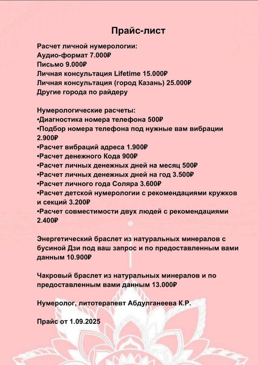 Прайс-лист ✨ Нумерология — инвестиция в себя Консультация по нумерологии — это не просто цифры. Это расшифровка ваших сильных сторон, подсказки судьбы и ответы на вопросы, которые помогают двигаться вперёд уверенно и без сомнений. Цена отражает опыт, знания и энергию, которую я вкладываю в анализ. А ценность — в том, что вы получаете ясность и понимание, которые экономят годы поиска и ошибок. 💎 Минералы и браслеты с Дзи — энергия, которая всегда с вами Каждый камень несёт свою вибрацию, усиливает ваши намерения и поддерживает на пути. В браслетах я соединяю силу минералов, древние символы бусин Дзи и вашу личную энергию, рассчитанную по дате рождения. Цена складывается из натуральных материалов и ручной работы, но настоящая ценность — в том, что вы получаете амулет, который работает для вас каждый день, помогая в гармонии, защите и достижении целей. 🌿 Цена — это цифра. ✨ Ценность — это трансформация вашей жизни. P’S в прайсе только стандартные позиции, все остальные расчеты и подбор