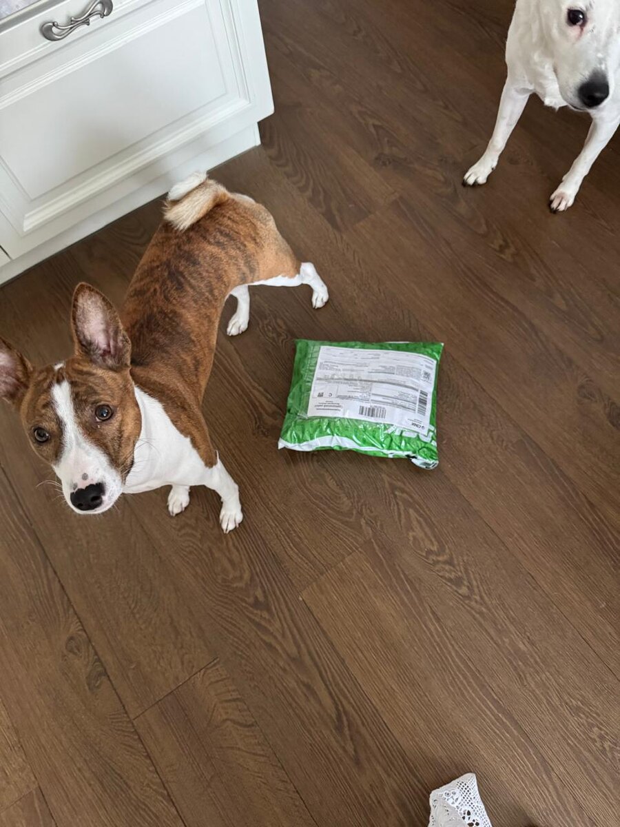 Пришёл наш донатный лук)))) Прям вот на 9 месяцев пришёл. По традиции распаковкой девочка сама занимается.) Ну прям с первой примерки, как влитой) Звезда сама в шоке) Гулять будем роскошно.) У Мольки своей шерсти полно, но всё равно явно завидует) Шмот прям под басенджи, с учётом длинючей шеи и длинноногости. Качество прям вот, как говорил мой друг, Смирнов.., - "яйцарасчешешь"...))) Спасибо всем огромное, черезвычайно огромное спасибо Марине!)
