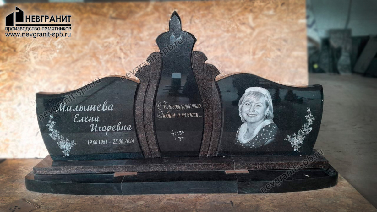 На фотографии представлен мемориальный памятник, посвященный Малышевой Елене Игоревне. Памятник отличается оригинальным дизайном, сочетанием цветов и гармоничным расположением элементов. Основу памятника составляет горизонтальная стела сложной формы, выполненная из черного гранита. Левая часть стелы украшена гравировкой в виде цветочного узора. На ней же выгравировано белым шрифтом имя усопшей: "Малышева Елена Игоревна" и даты жизни: "19.06.1961 - 25.06.2024". Правая часть стелы содержит овальный портрет Елены Игоревны с доброй улыбкой. Рядом с портретом также имеется гравировка в виде небольшого цветочного узора. Центральная часть памятника выполнена в виде двух вертикальных элементов из гранита красно-коричневого цвета, соединенных в верхней части фигурной перемычкой, создающей силуэт ангела. На одном из вертикальных элементов выгравирована надпись: "С благодарностью. Любим и помним...", а также цифры "49 БР / 1992". Памятник установлен на горизонтальном основании, выполненном из г