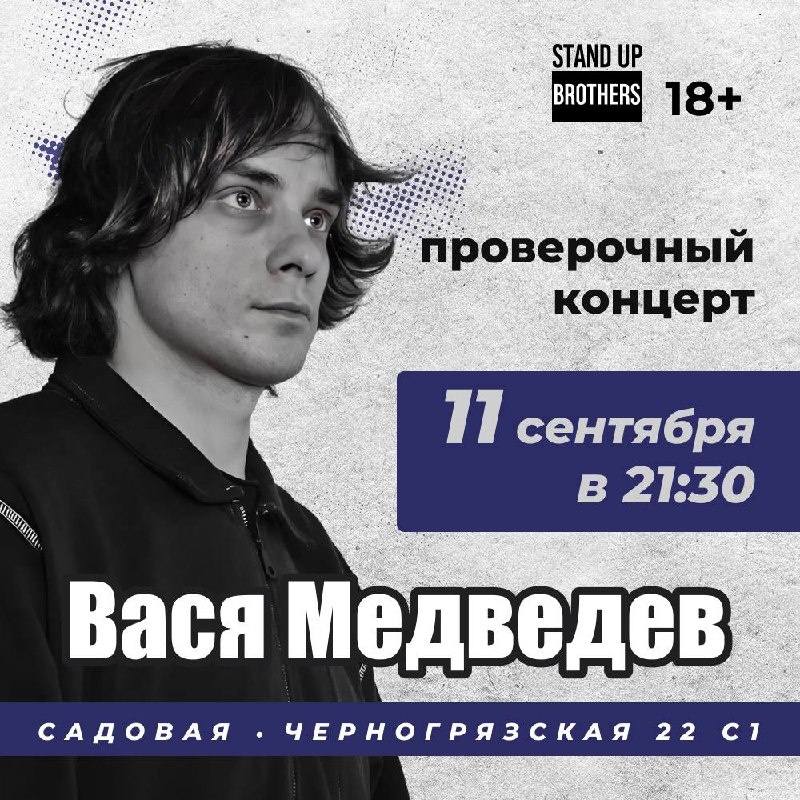 Вася Медведев с проверочным концертом в Brothers🎙️ Самобытный комик с нетривиальным взглядом на окружающий мир. Участник StandUp на ТНТ, автор двух сольных концертов «Меркурий 5000» и «30 серебренников». Давайте в следующий четверг просто отправимся за ним в уникальное юмористическое путешествие! КУПИТЬ БИЛЕТ 1000р 🎟️