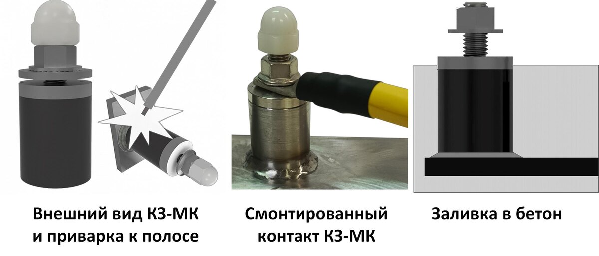 В части 1 рассмотрены Терминология, стандарты, примеры реализации. Наша конструкция контактов типа КЗ-МК особой оригинальностью не отличается, честно сказать, мы использовали готовое решение для агрессивных сред (по запросу одной нефтедобывающей компании), только несколько его улучшили. Ряд изображений контактов заземления для приварки КЗ-МК ниже. Теперь представим себе, что в одном месте нужно выполнить несколько подключений к заземленным металлоконструкциям. Ситуация вполне реальная. В этом случае придется приваривать несколько контактов. Но можно сделать и по-другому – вместо одиночного контакта использовать шину, где контактов несколько. Мы попробовали эту идею реализовать, и вот что получилось. Принцип такой же, как и в КЗ-МК: приваривается часть, выполненная из углеродистой стали, контактное соединение обеспечивают детали из хромистой нержавеющей. Серийно выпускаются шины с тремя контактами М6 и М10. К ним с помощью кабельных наконечников могут быть подключены кабели в широком д