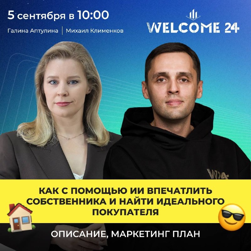 Как с помощью ИИ впечатлить собственника и найти идеального покупателя: описание, маркетинг план 🔥 Сегодня собственник всё чаще думает: «А зачем мне риелтор, если я могу сам выложить на Авито?» 👉🏼Ваша задача не рассказать, а показать, в чём именно ваша ценность. ИИ — ваш помощник, а не замена. Он усиливает вас в глазах клиента. Сделайте так, чтобы собственник почувствовал, что с вами его объект получит максимум шансов продаться быстро и дорого 😎 В эту пятницу в 10:00 пройдет вебинар, где обсудим: 1. Как ИИ потенциально вам может помочь 2. Что взять с собой на встречу 3. Структура разговора: что делать и что Говорить. Обсудим 8 этапов 4. Что можно оставить собственнику 🗣️Спикеры: — Галина Аптулина, ментор риелторов по соцсетям. «Лучший бизнес-тренер по соцсетям для риелторов» — Михаил Клименков, СЕО онлайн-агентства недвижимости WELCOME 24 Вебинар пройдет в Zoom, ссылка тут