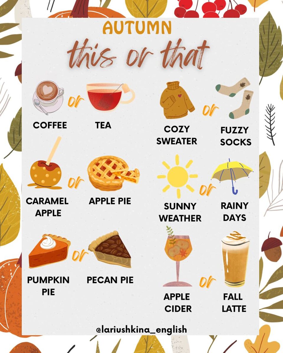 🍂 Привет, осень! А это значит, что пришла пора поспорить о самом главном!🍂 Теплый плед и книга или бодрая прогулка под дождем? Яблочный пирог или тыквенный латте? Уютный свитер или стильное пальто? Пройди мой осенний THIS OR THAT, где нужно делать выбор между двумя осенними удовольствиями 🍁 Идеально для warm up 🔥 Переходи по ссылке и копируй доску к себе ➡️ [this or that]