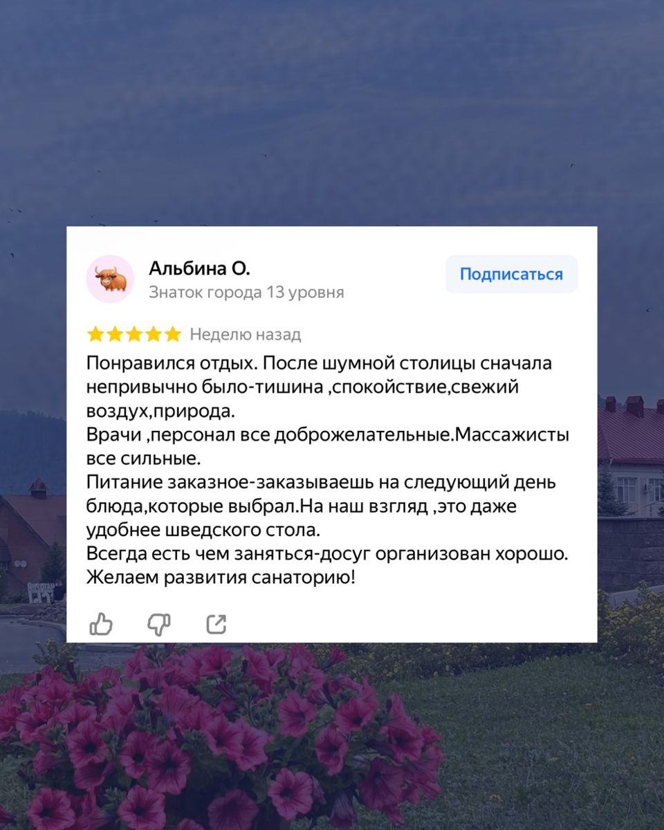 Именно благодаря вашему мнению мы постоянно улучшаем качество обслуживания, расширяем спектр услуг и создаём новые возможности для комфортного пребывания. Ваши улыбки и позитивные впечатления — главная награда для всех сотрудников экокурорта «Ассы».