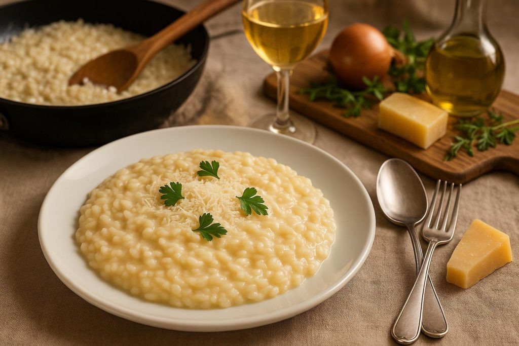 Идеальный выбор — итальянские сорта: арборио, карнароли или виалоне нано. Арборио — самый доступный, дает хорошую кремовость. Карнароли — элитный сорт, держит форму лучше арборио. Виалоне нано — традиционный венетский, очень нежный.