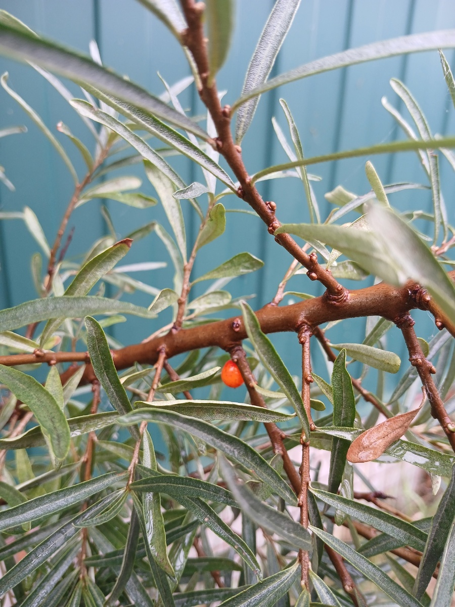 А точнее, облепихи. Первая вылезла из-под зелёного забора - подозреваем, что пришла к нам от соседей. Она умеет ползти корневищем, ну и навряд ли сама по себе выросла посреди леса. Ничего про неё не знаем - ни сорт, ни возраст. Вторая, у красного забора, досталась нам бесплатным саженцем. Опять же, ничего про неё не знаем. Разве что то, что она на пару-тройку лет моложе первой. Чего ещё мы не знали - девочки они или мальчики. Есть у них, у облепих, женские и мужские деревья. И для плодоношения девочкам нужен хотя бы один облепих в радиусе примерно 10 метров. Ещё есть самоопыляемые сорта - но, как я уже сказала, наши сорта для нас тайна, покрытая мраком. Самцов облепихи нужно искать ранней весной в питомниках. Ну, чтобы самолично по форме почек убедиться, что покупаете мальчика, а то впарят очередную мадам - солить их, что ли. А из того факта, что на обоих наших деревьях всё-таки созрело по несколько ягодок, можно сделать следующие выводы: 1) У нас растут две девочки-облепихи.