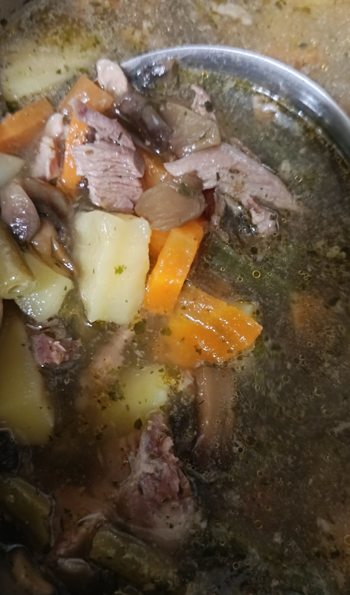 Вот и вечер, вот и ночь. 🌌 После ужина все равно есть охота... Днем так не хотелось, как вечером🙄 Покупала бананы, дети не хотят сказали, в итоге что? Съели все бананы, мне не досталось! 😑 Сама виновата, надо было сказать, чтоб мне один оставили... Завтра значит еще возьмём. 😉 Из индейки сварила суп, в нем стручковая фасоль, шампиньоны (из заморозки), картофель 2 шт, морковь, перец болгарский, специи и зелень 🌿. Я бульончик попробовала, вкусненько. Завтра на обед будет суп на первое))) На ужин приготовила тефтели 😋 Фарш вообще обалденный, одно удовольствие было из него готовить. Выбрала себе самый такой побольше тефтель, хотя они все примерно одинаковые. Готовила в духовке👌 Салат у меня всегда один и тот же, огурцы да помидоры. Единственное, что маслины забыла чёрненькие, с ними вообще классно получается 🔥Свежей зелени пока нет в магазине, надо в другом посмотреть, а то хочу укропчика свежего и салат, а нигде нет. Надо будет в интернете поискать еще какие-нибудь рецепты, чтоб