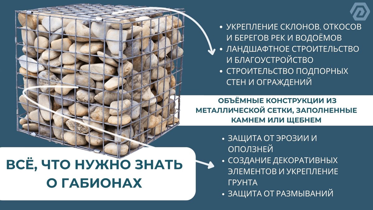 Разберём всё по порядку — просто и по делу. Габион — это объемная сетчатая структура с шестиугольными ячейками, изготовленная из оцинкованной проволоки. Внутри нее размещаются камни, щебень или другие материалы. Он создает прочную и монолитную конструкцию, способную выдерживать внешние нагрузки и природные воздействия. Благодаря этой особенности, габионы легко подстраиваются под неровности рельефа и гармонично вписываются в ландшафт. 📌 Предназначен для укрепления грунтов, защиты от эрозии и создания прочных инженерных сооружений. Габион устанавливается на подготовленное основание и заполняется тяжёлым материалом — чаще всего камнем. Благодаря своей жёсткой структуре он: 📌 Это делает габионы идеальными для работы с водой и на склонах. 🔹 Высокая прочность и устойчивость