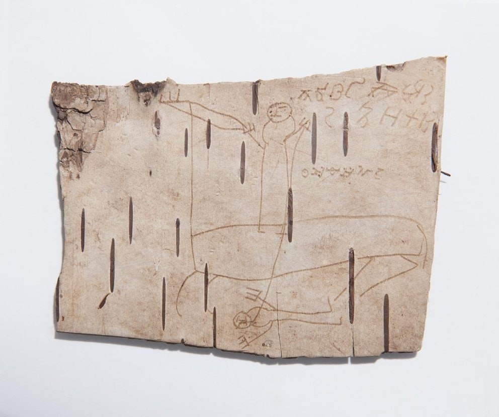 НЕДЕЛЯ УЧЕНИЯ В ЗЕЛО! Рисунки новгородского мальчика Онфима, 1240-1260 гг. Онфим — новгородский мальчик XIII века, автор берестяных грамот и рисунков. Всего почерком Онфима написано 12 грамот, а кроме того, ему принадлежат несколько берестяных рисунков. Судя по рисункам, Онфиму было 6—7 лет. На неумелых, но по-своему выразительных картинках мы видим лошадей, воинов в шлемах и плащах, сцены боя, летящие стрелы, всадника, поражающего врага. Под этим всадником Онфим, мечтавший сам стать воином, подписал своё имя: «Онѳиме»
