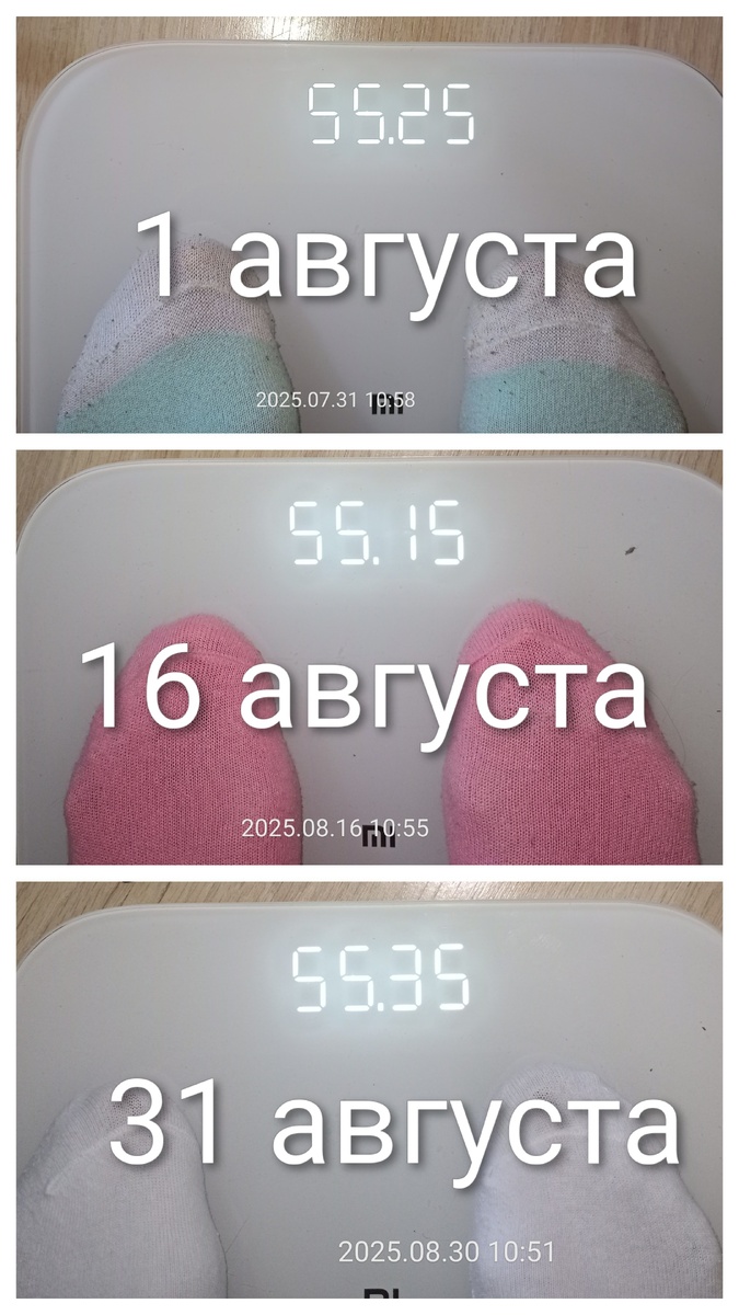 Всем привет! С Вами Татьяна, пенсионерка. Мне 74 года, рост 151 см, вес 55,35 кг ✅ 27.02.23 мой вес был 82 кг. В процессе своего похудения в течение 2023-25 года я сбросила 25 кг лишнего веса. *** Изменения веса в течение месяца 👇 Изменения веса за 2023-25 год👇 Изменения средней суточной калорийности по месяцам за 2025 год. 👇 Изменения объёмов фигуры👇 *** Подведение итогов похудения за август 2025 года. *** Первую половину августа я провела на даче, много гуляли, отмечали семейный праздник в пиццерии вкусной едой, ездили загорать в Тишково на Учинское водохранилище. Внук купался, я не рискнула, вода прохладная. Фото с пляжа в Тишково в августе 2025 и в Тамани в сентябре 2022 года. Разница очевидна. С 14 августа начался Успенский пост, но были праздники - 19 августа Преображение Господне, 28 августа Успенье Пресвятой Богородицы и тем не менее в августе я не превысила 55,35 кг. Постоянно радуюсь, что мне удалось избавиться от ожирения. Вспоминая ту