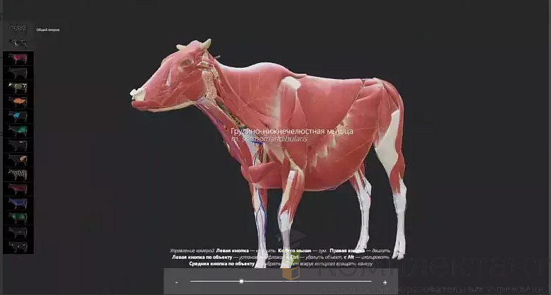 Интерактивный атлас — это цифровая база знаний по анатомии, физиологии и патологии животных с детализированными 3D-моделями. Пользователь свободно вращает органы,