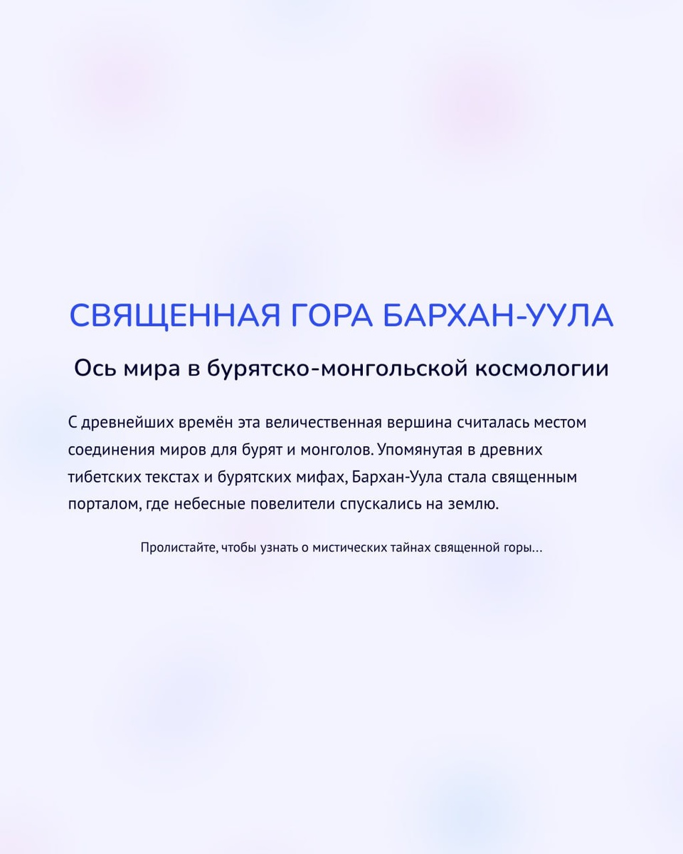 Священная Гора Бархан-Уула С древнейших времён эта вершина считалась осью мира для бурят и монголов. Её упоминали в тибетских текстах и бурятских мифах как место, где сходили небесные повелители. Ещё больше интересного контента ждут тебя. 👉 Подписывайся: https://dzen.ru/id/670c7fe545d6d72caa724e37