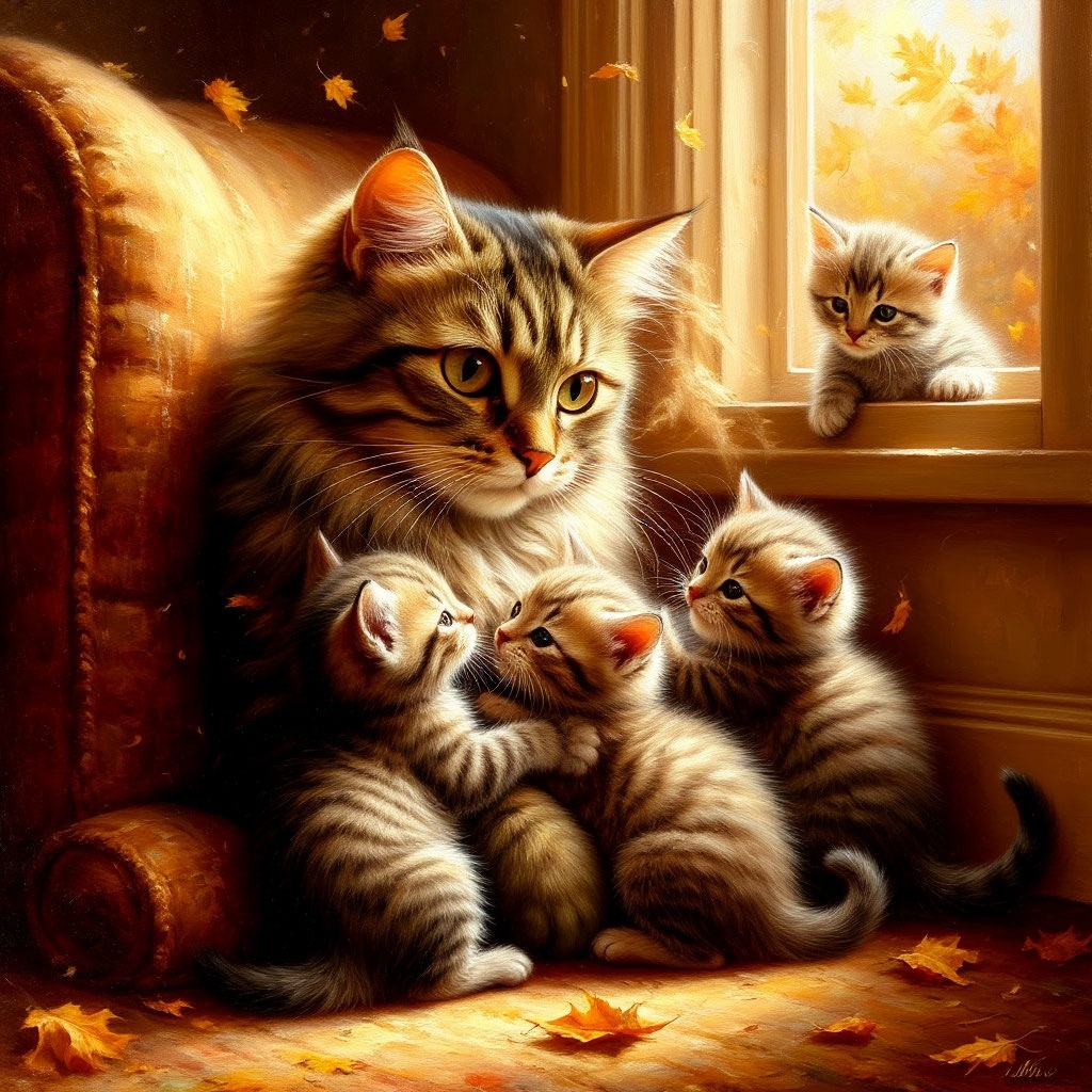 Осеннее солнце лениво пробивалось сквозь багряную листву клена, окрашивая двор в теплые, медовые оттенки. Мурка, кошка с глазами опавших листьев и шерстью цвета осеннего мха, грелась на крыльце, погруженная в свои мысли. Или, скорее, в свою тоску. Последние несколько месяцев внутри нее зрело какое-то щемящее чувство. Она видела беременных кошек, гордо вышагивающих по улице, слышала писк котят из соседского сарая, и каждый раз ее сердце болезненно сжималось. Ей так хотелось почувствовать под боком тепло маленького, дрожащего комочка, услышать тихое, доверчивое мурлыканье. "Бесполезно мечтать," - вздохнула она про себя, облизывая лапу. - "Видимо, мне не суждено стать мамой." В этот момент из дома вышла Анна, ее хозяйка. Добрая женщина с лучистыми глазами и руками, пахнущими пирогами. "Что ты такая грустная, Мурка?" - спросила Анна, присаживаясь рядом и гладя кошку по спине. - "Чего тебе не хватает, солнышко? У тебя же все есть: и вкусная еда, и тепло, и мягкая подушка…" Мурка потер