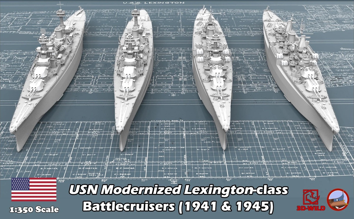 3D-Wild Miniatures из США выпускает на 3D-принтере модели нескольких вариантов модернизации американского линкора класса Lexington в масштабе 1/350: Design A Full Hull Kit (каталожный номер MFSY004) Design B Full Hull Kit (MFSY006) Design C Full Hull Kit (MFSY008) Design D Full Hull Kit (MFSY010) Design A Waterline Kit (MFSY005) Design B Waterline Kit (MFSY007) Design C Waterline Kit (MFSY009) Design D Waterline Kit (MFSY011)