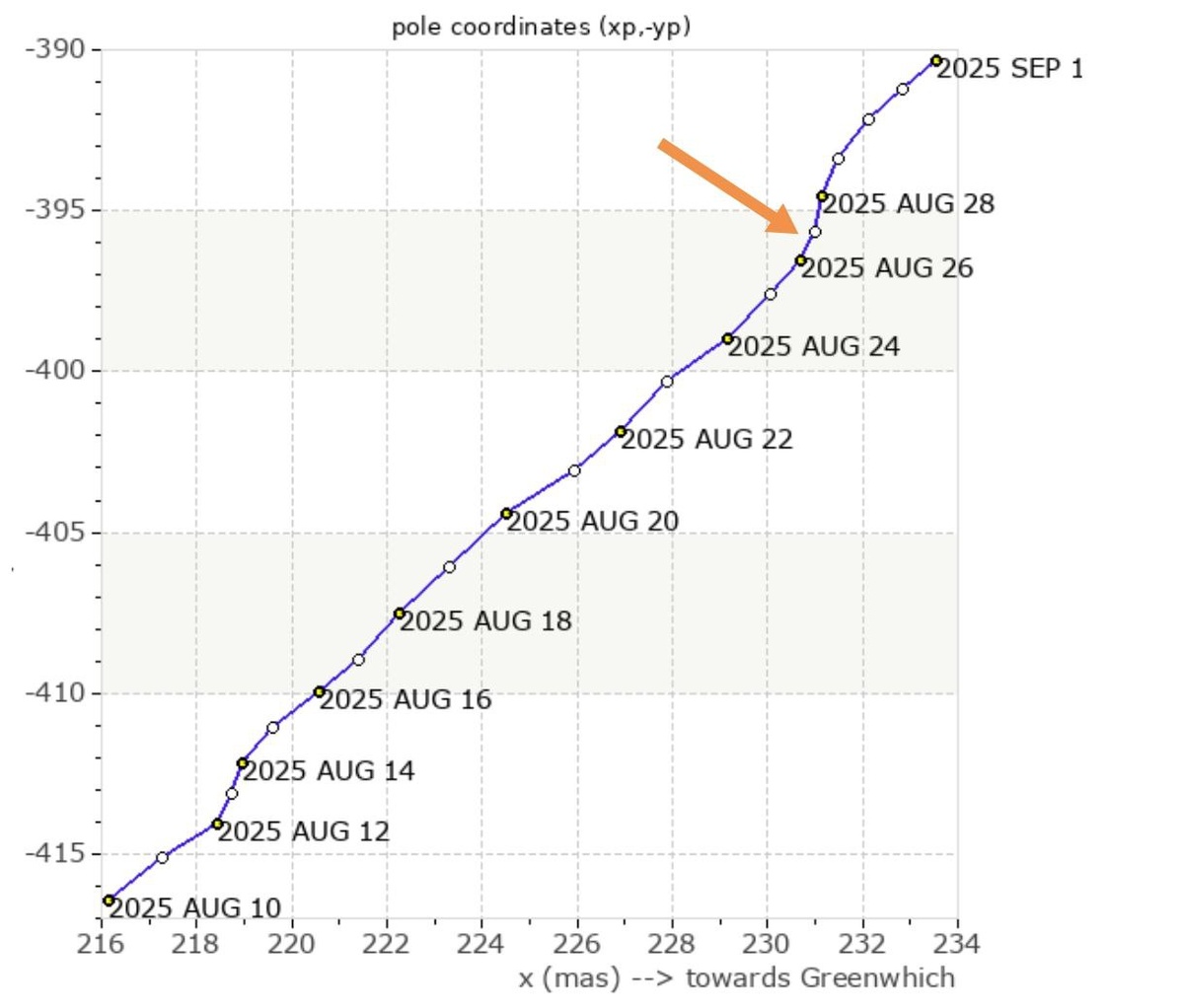 Магнитная 🧲 буря от 26 августа оказалась сейсмоэффективной и сказалась на траектории полюса вращения Земли. Ждем теперь последствия по гармоникам на 7-е, 14-е, 21-е сутки +/-2 дня. ===== The magnetic storm of August 26 proved to be seismically effective and affected the trajectory of the Earth's rotation pole. We are now waiting for the harmonic effects on the 7th, 14th, 21st days +/-2 days.