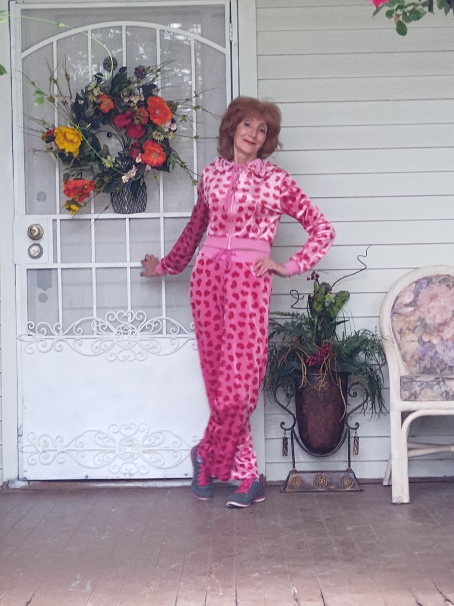 Здесь я на крыльце своего дома - собираюсь в поход в мгазин. Да, костюм велюровый все тот же- он у меня любимый, хотя конечно не единственный. ПРосто сейчас такая погода и сезон- очень подходяший именно для этой одежды. Костюм точно по моему размеру -42, а это непросто найти. Фактически детский размер. Мне вобще трудно находить одежду для себя - мне все велико! с моими пожизненно 45 кг веса и тонкой костью. А этот костюм нашла случайно - и теперь его не снимаю. Очень люблю.