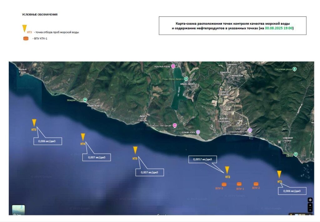 По результатам непрерывного экологического мониторинга, превышений предельно допустимых концентраций загрязняющих веществ в морской воде и воздухе в районе морского терминала Каспийского Трубопроводного Консорциума (КТК) не выявлено. В ходе и после завершения операции по ликвидации последствий инцидента постоянно велся мониторинг состояния морской воды, береговой полосы и атмосферного воздуха. Загрязнений береговой линии зафиксировано не было, а применение сорбентов не потребовалось, — уточнили в КТК. Для контроля содержания нефтепродуктов в воде отбираются пробы с привлечением аккредитованной лаборатории. На данный момент проанализировано уже 115 проб. После завершения основных работ было принято решение организовать отбор проб в пяти контрольных точках, выбранных исходя из траектории движения нефтяного пятна во время инцидента. Мониторинг в этих точках (возле Широкой Балки, Дюрсо, Малого Утриша и др.) продолжается дважды в день. Согласно предоставленным данным, с 30 августа до настоя