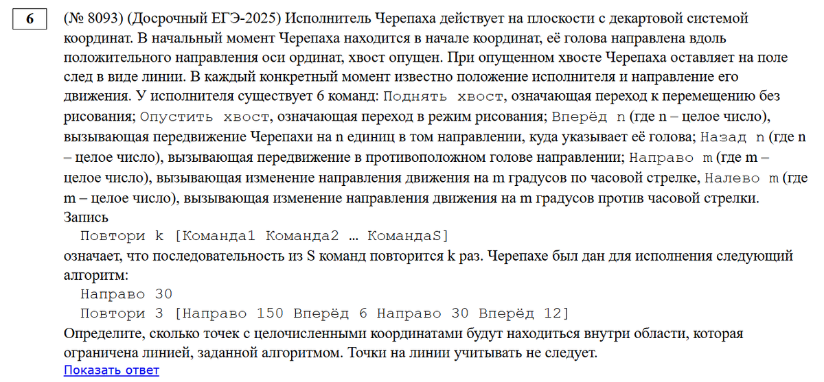 Задача с сайта Полякова К. Ю. Досрочный ЕГЭ-2025 открываем кумир если будет открыто похожее окно или с элементами, которые нам не нужны, все равно делайте пошагово, как будет написано закрываем окно робота закрываем справку будет так далее окна - черепаха будет так настроим Черепаху правильно Авто убрать галочку! кликнуть на 1:1 далее пишем основу алгоритма теперь читаем условие небольшие условности: ось ординат - это вертикальная ось! ось абсцисс - горизонтальная ось!! и просто переписываем код Направо 30