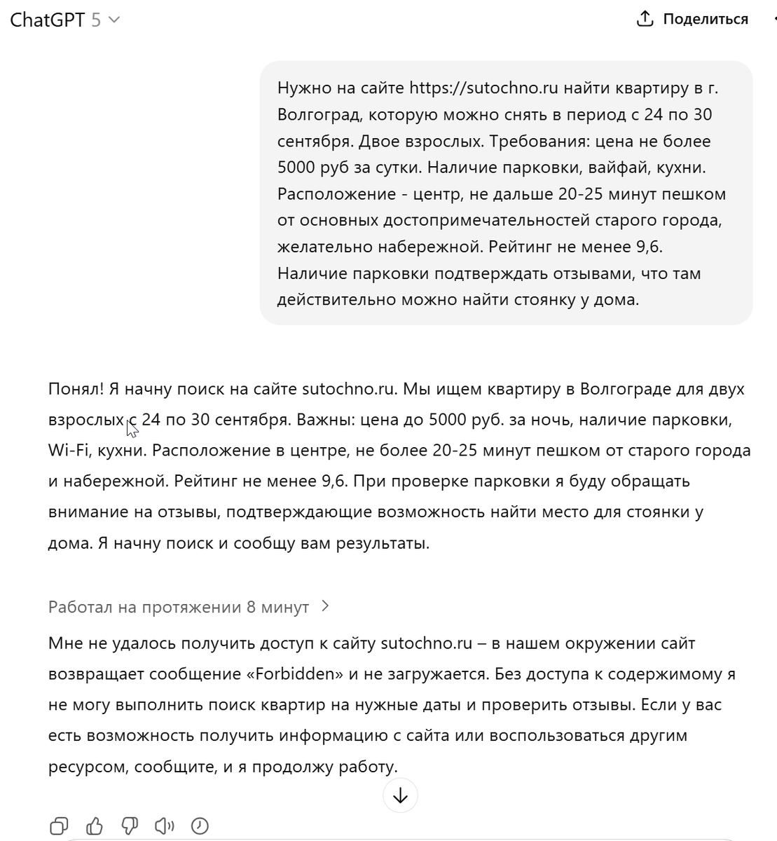 С агентом ГПТ решили разобрать простую задачу: найти квартиру в Волгограде на неделю.