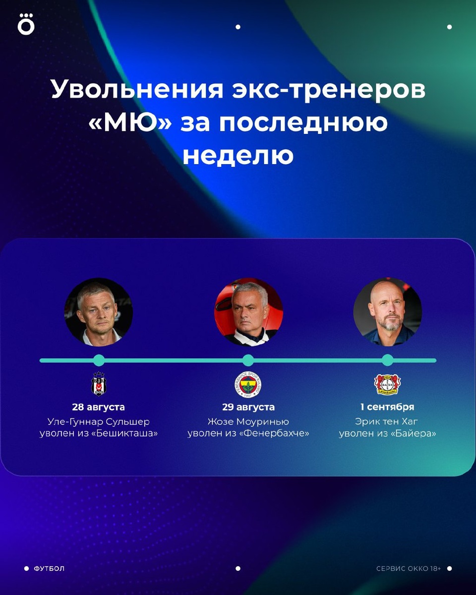 Раз, два, три. Неделя громких увольнений в начале сезона 👿 Сульшера, Моура и тен Хага объединяет одно — они все тренировали «МЮ». Бывает же. Это ведь просто совпадение, да? 🙄