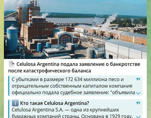 📄 Celulosa Argentina подала заявление о банкротстве после катастрофического баланса С убытками в размере 172 634 миллиона песо и отрицательным собственным капиталом компания официально подала судебное заявление: "объявила себя в конкурсном производстве" (аналог процедуры банкротства- ред.). Ее заводы остаются остановленными, с мая действует дефолт, и компания сталкивается с требованием о банкротстве от кредитора ℹ️ Кто такая Celulosa Argentina? Celulosa Argentina S.A. — одна из крупнейших бумажных компаний страны. Основана в 1929 году, специализируется на производстве и продаже целлюлозы, бумаги (офисной, туалетной, упаковочной) и изделий из древесины. Эксплуатирует крупные производства в Санта-Фе (Capitán Bermúdez) и Буэнос-Айресе (Zárate), входит в группу Tapebicuá