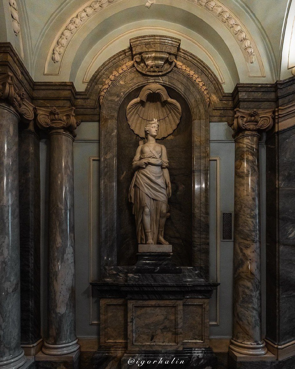 😎Парадная лестница в Мраморном дворце 😎Скульптуры в её нишах олицетворяют время суток. Между первым и вторым этажами нас встречает статуя «Ночь». Поднимаясь далее, мы видим статую «Утро», затем «День», который сменяет «Вечер». 😎На площадке между вторым и третьем этажами находятся скульптуры «Весеннее равноденствие» и «Осеннее равноденствие». Стены третьего этажа украшают горельефы с аллегориями лучших человеческих качеств - Умелости, Силы духа, Благоразумия и Справедливости. 📸 Игорь Халин Петербургские истории 📝 Лучшие места и истории 👼