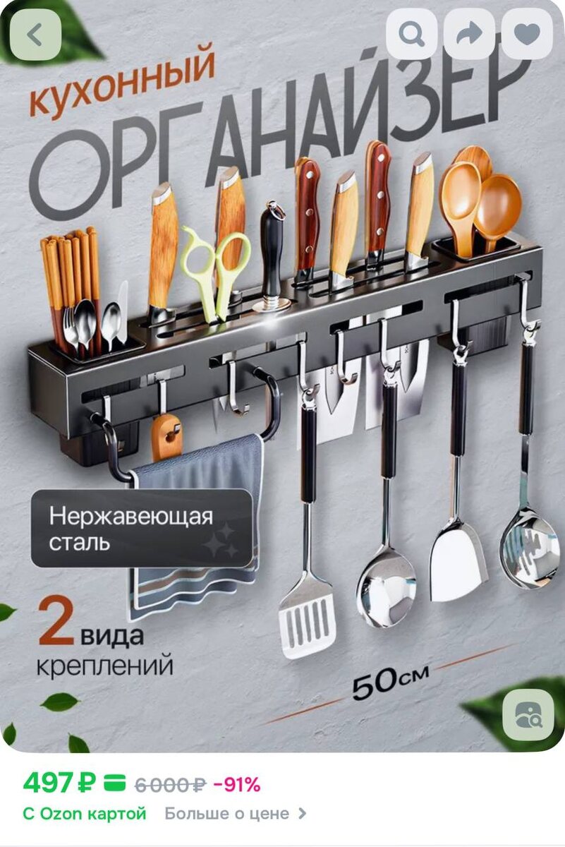 Я сейчас в поиске нового органайзера для кухни, поэтому много времени провожу на OZON в поисках подходящего по цвету и того, что вместит огромное количества кухонных принадлежностей, накопленных годами😄. Решила за компанию поделиться поисками и с Вами, возможно кому-то также пригодятся плоды моих трудов и удастся сэкономить время при наведения порядка и расхламлении. Как Вы уже помните, то я фанат всевозможных органайзеров и на канале есть много обзоров в разделе Ролики, обязательно загляните 😉. Дисклеймер Данная статья не является рекламной, не призывает к покупке указанных товаров, выражает субъективное мнение автора и предназначена исключительно для информирования. Продолжая чтение Вы соглашаетесь с выше указанной информацией. Что же я нашла интересного в этот раз: Артикул : 1858528367 Данная модель выполнена из нержавеющей стали, длиной целых 50 см и оснащена 8 удобными передвижными крючками, также есть съемная вешалка для полотенец и 2 стакана. Огромный вместительный о