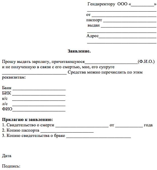 - На основании полученного свидетельства нужно написать заявление на имя работодателя умершего сотрудника, предоставить его в бухгалтерию и получить денежные средства зарплаты по наследству удобным способом.