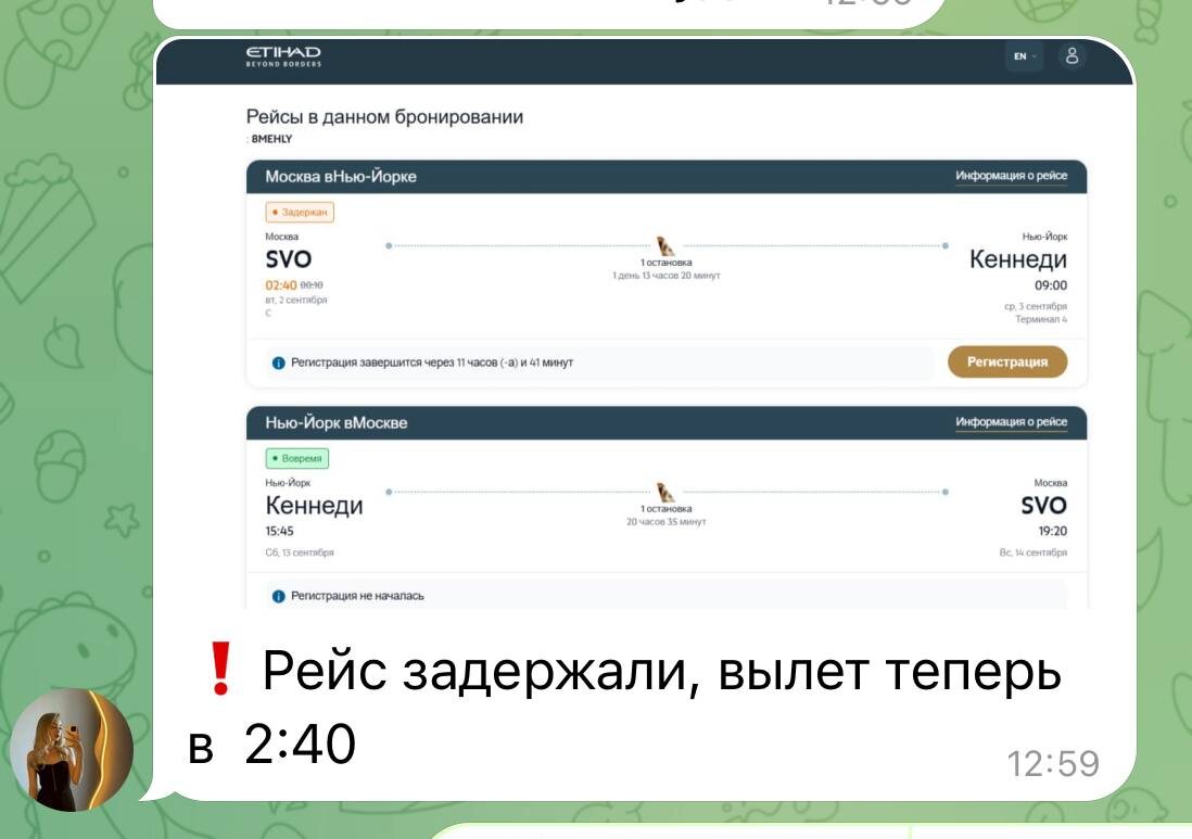 Как началось мое путешествие в Нью-Йорк Сегодня получил информацию, что мой рейс перенесли на 2,5 часа. Но присмотревшись внимательнее увидел, что пересадка вместо 3х часов, стала СУТКИ + 13 ЧАСОВ!🤯😱 В последнее время подустал от сюрпризов. Но решил, что я сильнее обстоятельств. Что не убивает нас, делает сильнее. Плюс очень хочу перезагрузиться. Экстренно взял другие билеты и теперь вместо Этихада лечу Узбекскими авиалиниями. Надеюсь, что рейс не задержат. И держу пальчики, чтобы мне вернули деньги за предыдущие билеты, т.к. ждать подтверждения возврата времени уже не было. Впереди 20 часов перелёта..., но впервые за 2 года без детей!) Рассказывать вам здесь о поездке в Америку? ❤️ - конечно, интересно! 🙈 - не надо —— © телеграм | вк | дзен | ютуб |