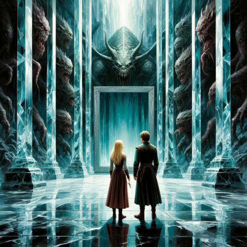 Когда Галь-Рикки и Эльза прошли очередной поворот, следуя прихотливым изгибам мерцающего коридора, то перед ними открылся зал, настолько просторный, что в нем мог поместиться весь Лемминк вместе с полем для пашни. Эльза Дер Махт негромко ахнула. С теряющегося во мраке потолка свисало множество фигур в форме перевернутых пирамид, похожих на пещерные сталактиты, только много больше по размерам и испускающих тусклый синий свет. В остальном же это огромное помещение было совершенно пустым, если не считать установленного в самом центре на железной подставке высокого овального зеркала. Зеркало казалось неуместным здесь, как роза, внезапно распустившаяся посреди сугроба.