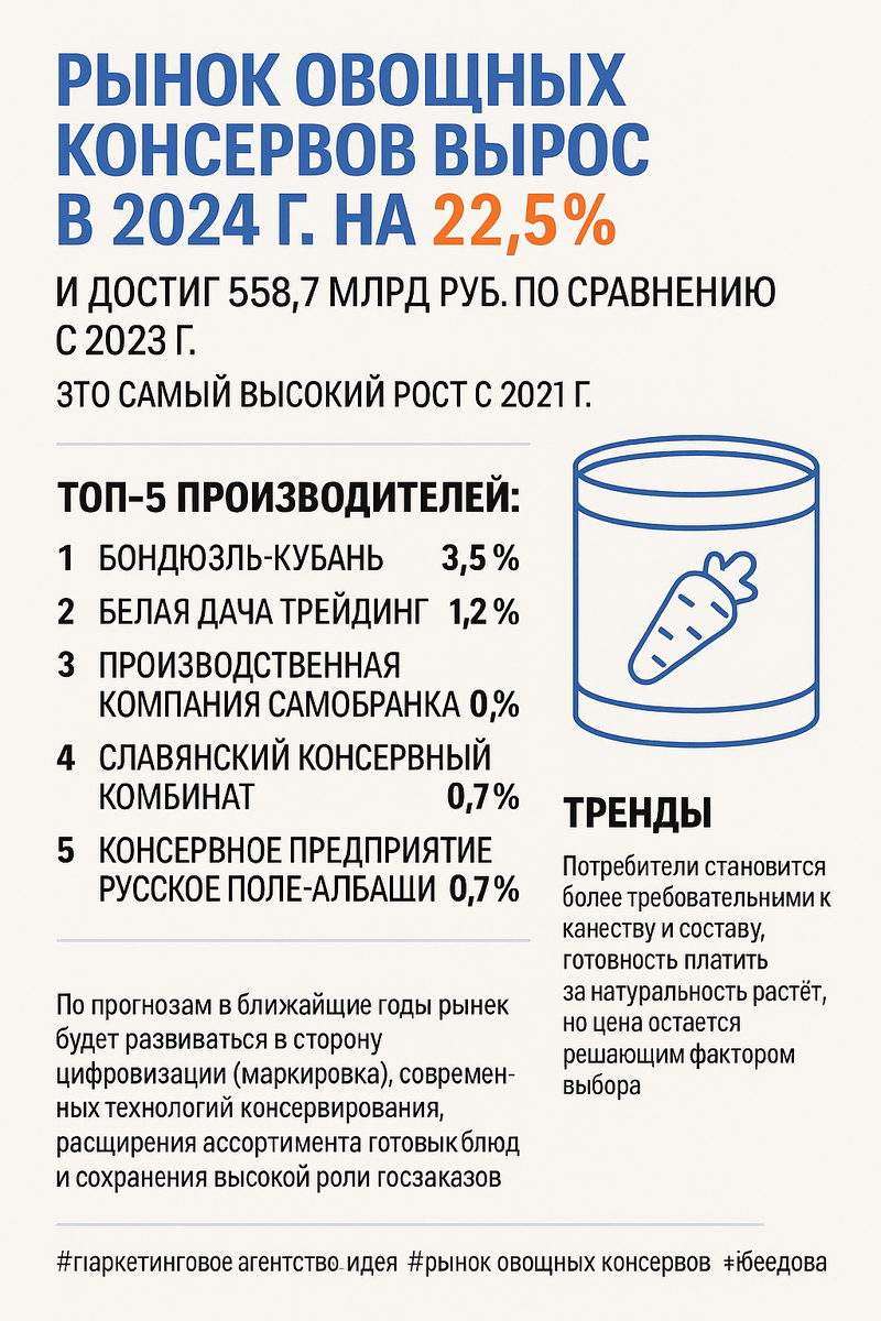 🏭 ТОП-5 производителей: 🔮 Тренды: рост требований к качеству и составу, усиление роли цены, развитие цифровой маркировки и технологий, расширение готовых блюд, стабильные госзаказы. #маркетинговое_агентство_идея #рынок_овощных_консервов #исследования