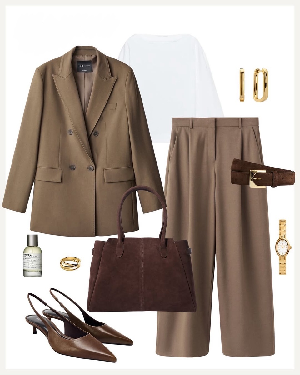 Олива/тауп (жакет) + мокка (брюки) + молоко (лонгслив) + тёмный шоколад (сумка/ремень/обувь) + золото (фурнитура).