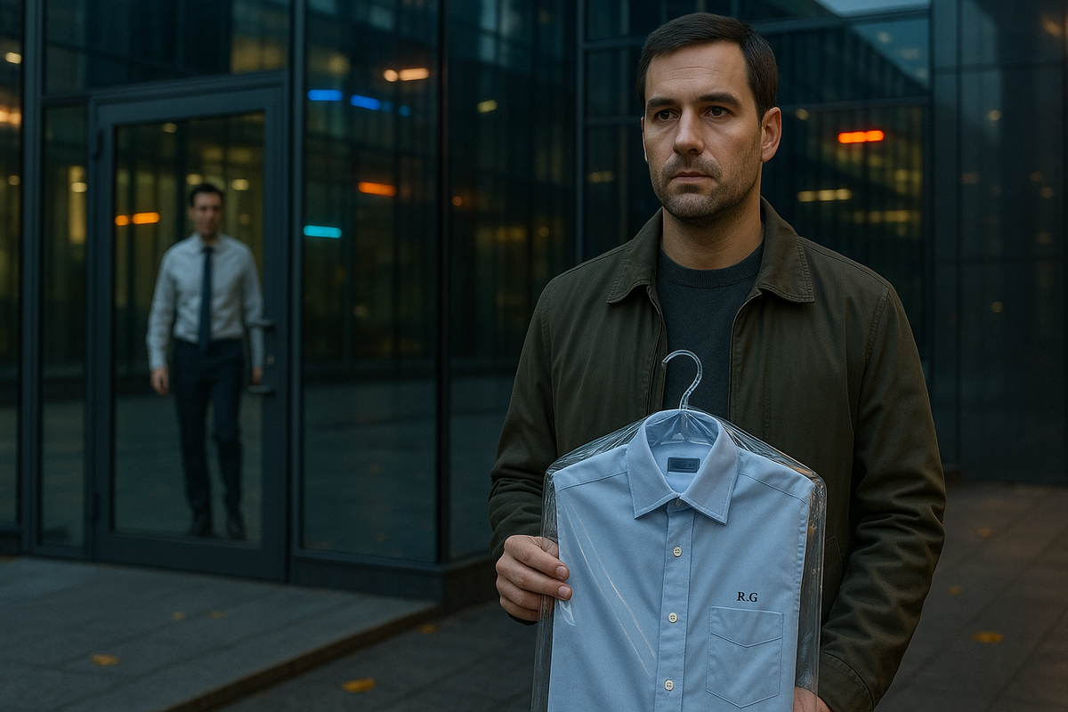 Я вытащил рубашку, аккуратно сложенную, с видимой недостающей пуговицей и вышивкой «R.G.», и положил на стойку. На секунду лицо Романа распалось — как бумажный самолёт, врезавшийся в стену. Он быстро собрался, сказал: