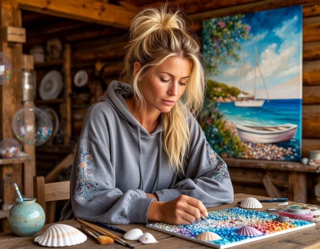 Михаил, затаив дыхание, наблюдал за женой. В её руках, словно по волшебству, скромные дары моря преображались в диковинные сокровища: шкатулки невиданных форм, причудливые бусы и забавных морских зверушек. Картины, рождавшиеся под ее руками из ракушек и камешков, дышали первозданной красотой, словно сошедшие с полотен старых мастеров, овеянные бризом и шепотом волн.